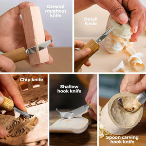 What's In The Box? 5 Razor Sharp Knives: General Roughout Knife (2" blade) Detail Knife (1.75" blade) Chip Knife (1.5" blade) Shallow Hook Knife Spoon Carving Hook Knife AccessoriesΒ Leather Knife Sheaths Leather strop and sharpening compound Canvas Tool Roll Experience superior craftsmanship with our Deluxe 5pc wood carving knife set. Featuring: Perfectly balanced hardwood Ash handles for comfort and control Razor-sharp high-carbon...